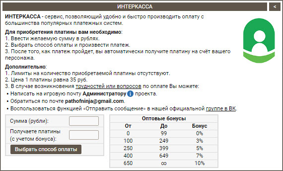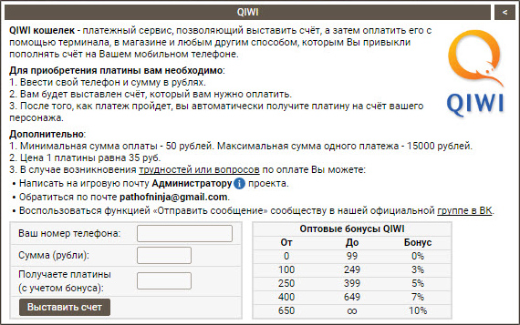 - Купить у другого игрока за золото при участии Администрации (доступно для персонажей 15+ уровней). Максимальная цена - 200 зол/пл. Во время приобретения НОВОЙ (за реальные деньги) платины игрок, желающий продать свою платину и ее покупатель, должны прислать письмо на игровую почту Первому Шиноби. Например: